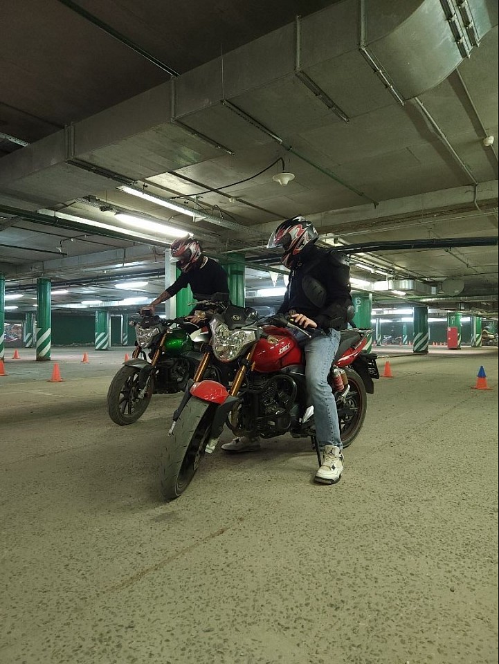 Занятия начинаются с оценки уровня подготовки ученика и подбора упражнений под его задачи. Обучение проходит в спокойном темпе на крытой мотоплощадке, без влияния погоды и городского трафика. Основной акцент делается на контроль мотоцикла, баланс, работу с газом и торможение. Такой формат позволяет безопасно прогрессировать и уверенно подготовиться к выезду в город.